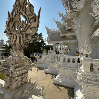 We took a car from Chiang Mai to Chaing Rai which is usuallly a tour, but for us it was efficient site seeing meets transport. Our first stop was the famous white temple. Well, if you wanted to see the set of Frozen, this is your place. Not sure how religious it feels. More like Disney. But so creative! A wax figure of a meditating munk inside is so real people stand and debate if it is. No pictures are allowed. The white signifies purity. Glass mosaics accent all the facades.