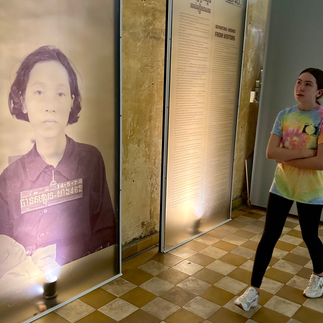 How this happened, in the 1970s, is hard to understand. The Vietnam War in the early 70s and then next door, the S-21 and a total of 196 camps created to torture and kill, and then to send on to the Killing Fields in Cambodia's genocide. Some 3M died of execution, forced labors, starvation and diseases. The whole regime of Khmer Rouge only lasted 3 years, 8 months and 20 days from 4.17.75 to 1.6.79. In that time the city of Phnom Penh was literally emptied. The prisons remained to host those who could possibly object including intellects, writers, teachers, artists and anyone who was educated. The 'prison' we visited was a kid's school in the heart of the city. They just cleared out the desks and put in wood cells and metal bed frames to which they chained, tortured and executed people. The place was secret yet existing in plain site, but alas the city had been emptied. The make shift prison was called S-21. If people survived here, they went to the Killing Fields, where they were executed (or partially executed) and dumped in mass shallow graves. Women and children were not spared.